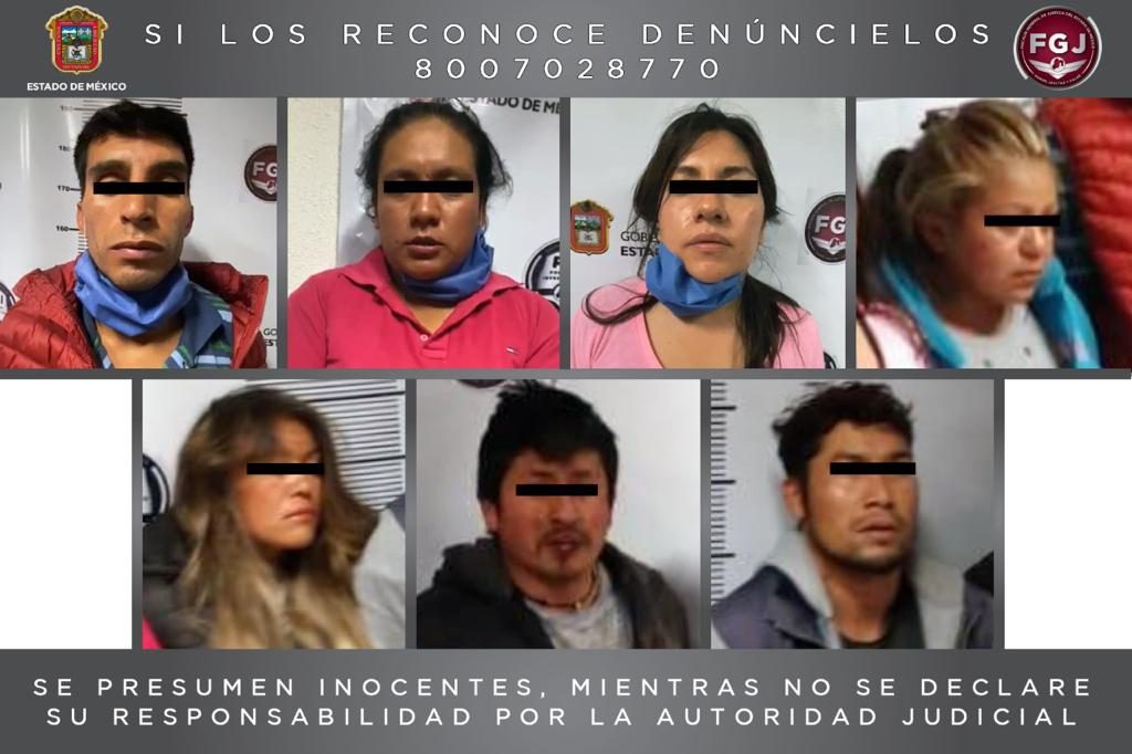 Los siete detenidos fueron identificados como Marisol “N” de 29 años de edad; Yuliana “N”, de 34 años; Juan “N”, de 35 años; Norma Angélica “N”, de 33 años; Marisol “N”, de 37 años; Alberto “N”, de 33 años y Giovani “N”, de 24 años.