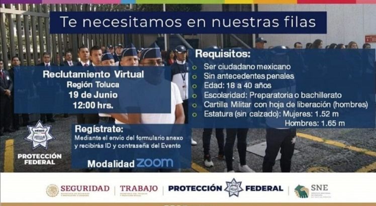 Toluca, México; 19 de junio de 2020. El Servicio Nacional de Empleo mexiquense, en coordinación con el Servicio de Protección Federal, realizará durante junio y julio Bolsas de Trabajo virtuales para reclutar a mexiquenses que deseen concursar por una plaza como policía, informó el Director General de Empleo y Productividad de la Secretaría del Trabajo, José Antonio Corona Yurrieta.