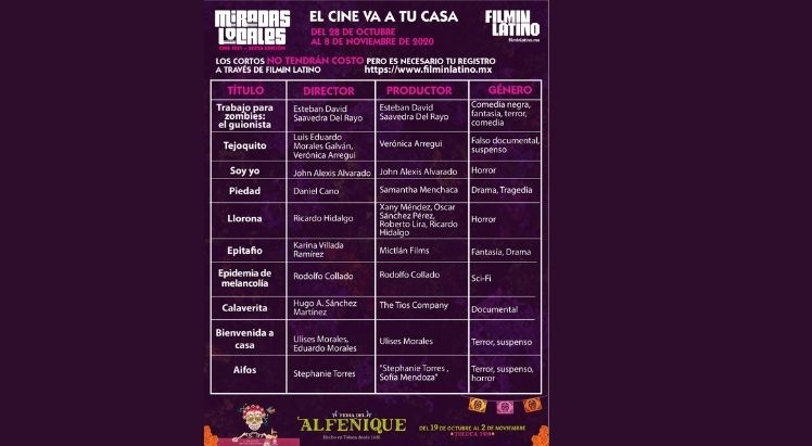 Los interesados podrán mirar producciones de terror, suspenso, horror, drama, falso documental, comedia negra, fantasía y tragedia. Entre las obras que podrán ver se encuentran: Trabajo para zombies: el guionista, Tejoquito, Soy yo, Piedad, Llorona, Epitafio, Epidemia de Melancolía, Calaverita, Bienvenido a casa y Aifos.