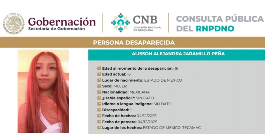 El Estado de México acapara el 17 por ciento de las desapariciones en México, de personas de entre 15 y 19 años, de acuerdo con estadística recopilada por el Registro Nacional de Personas Desaparecidas y No Localizadas (RNPDNO). Estas cifras corresponden a desaparecidos de 2023, 2024 y 2025, en periodos que contabilizan casos sucedidos entre enero y octubre de los años mencionados.