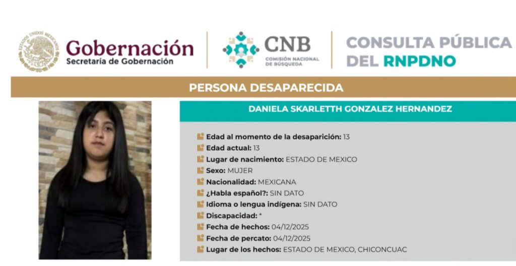 Este 8 de diciembre el RNPDNO ha publicado las fichas de los diez desaparecidos registrados en las últimas 72 horas. De ellos, dos son mujeres de entre 13 y 16 años, y están domiciliadas en el Estado de México. Representan el 20 por ciento.